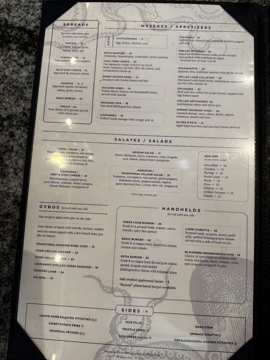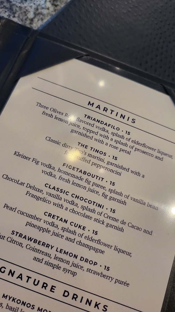 Highlights like grilled octopus, spanakopita, and lobster pizza showcase the variety and inviting nature of the menu, while satisfying desserts such as chocolate cake and fried ice cream provide a comforting finish. The drink options, including well-crafted martinis and regional sparkling wines, complement the food and add a calming, social touch to the meal.